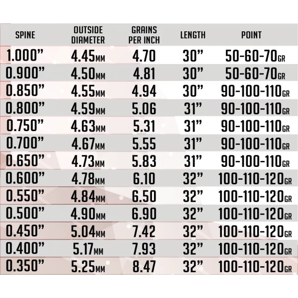 | SPINE | OUTSIDE DIAMETER | GRAIN PER INCH | LENGTH | RECOMMENDED POINT |